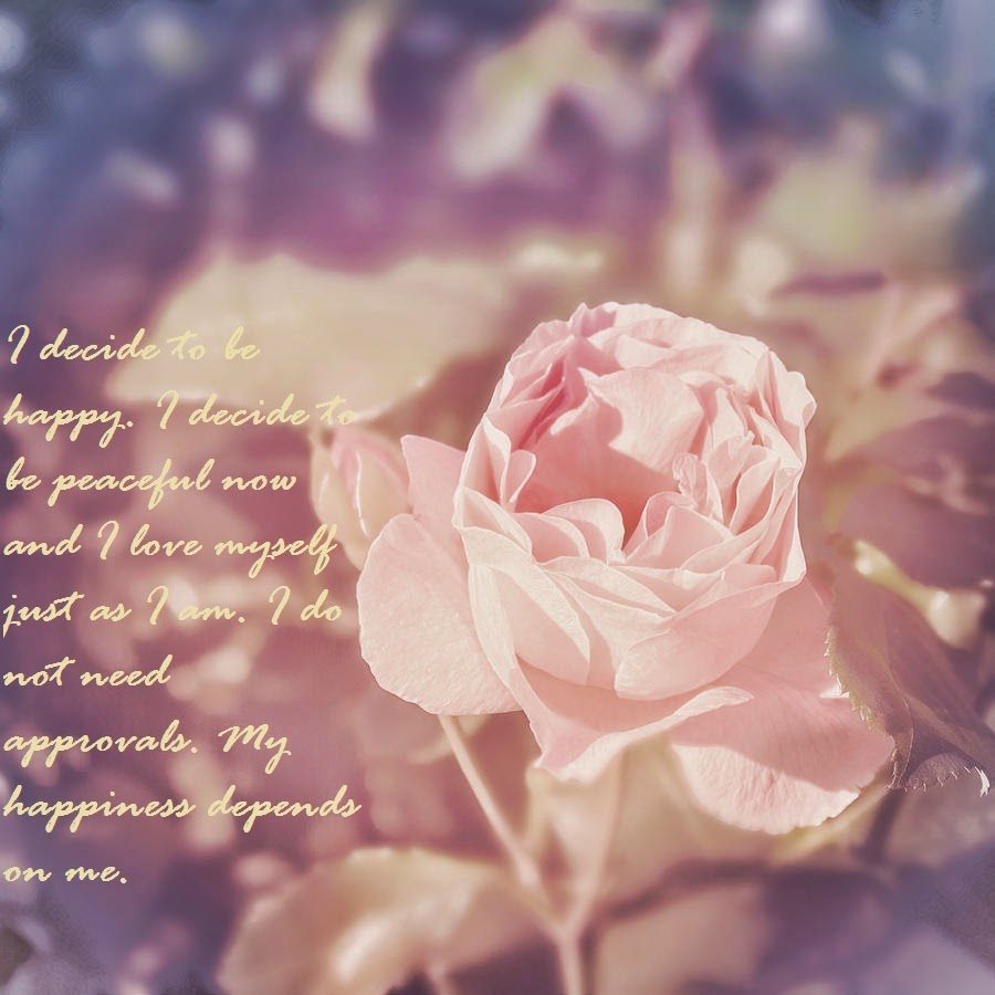 I decide to be happy. I decide to be peaceful now and I love myself just as I am. I do not need approvals. My happiness depends on me.