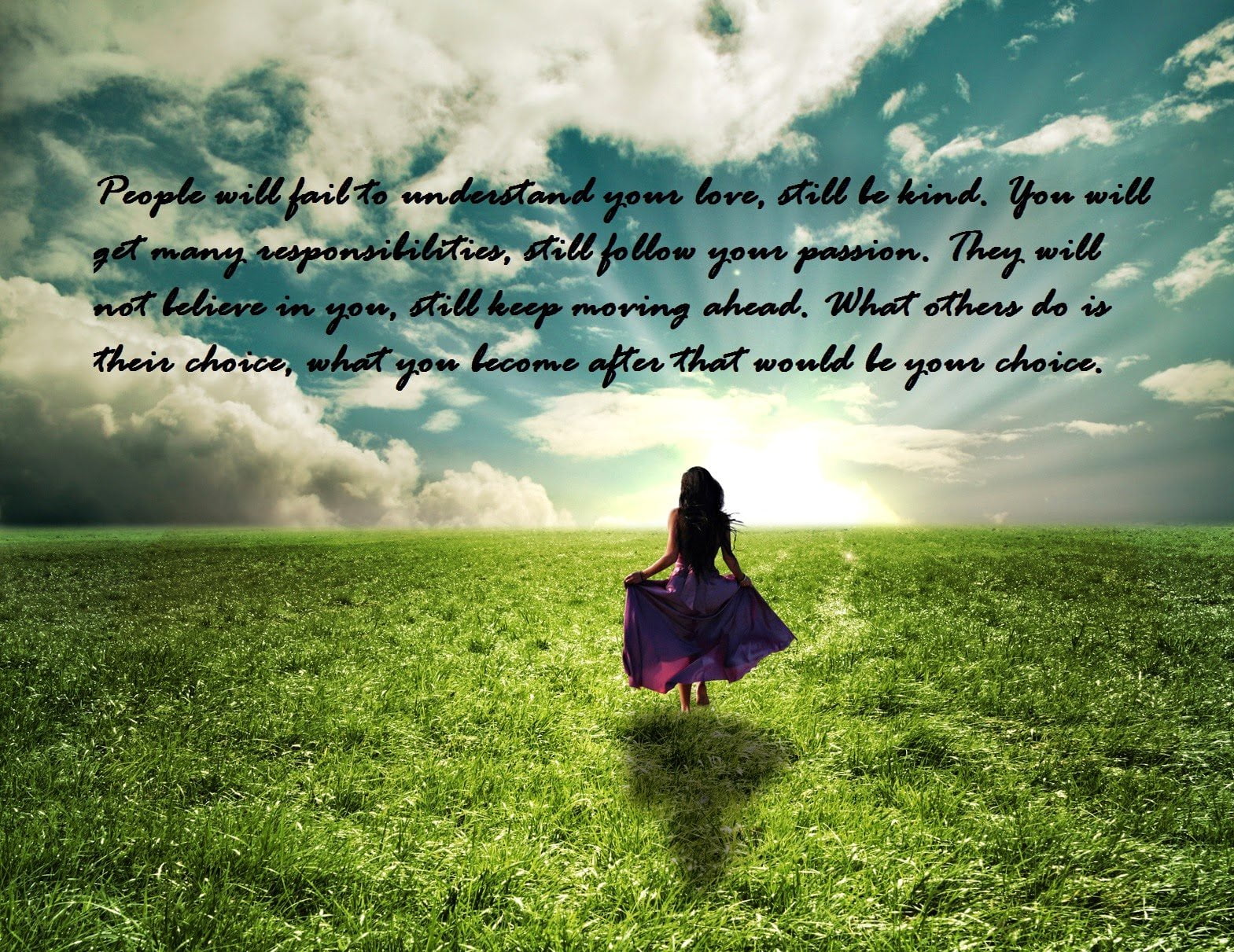 People will fail to understand your love, still be kind. You will get many responsibilities, still follow your passion. They will not believe in you, still keep moving ahead. What others do is their choice, what you become after that would be your choice.